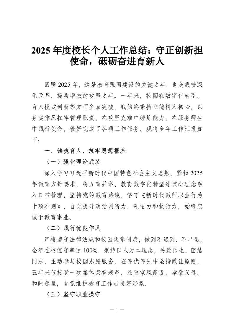 2025年度校长个人工作总结:守正创新担使命,砥砺奋进育新人