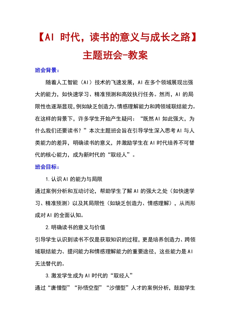 首页班主任资料班会教案【通用】【思辨讨论】主题班会:AI 时代读书的意义与成长之路 教案